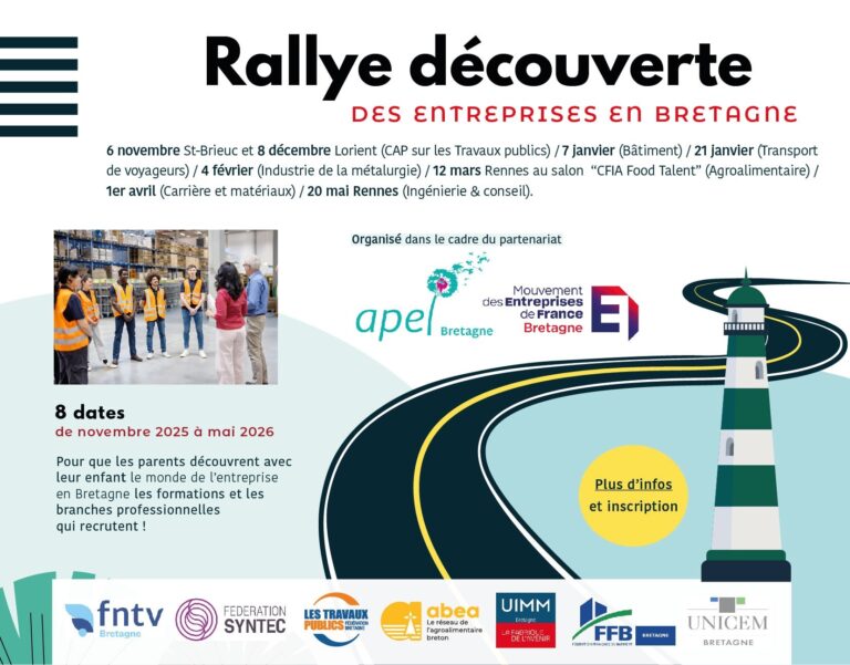 Cette année, les adhérents du MEDEF Bretagne et l’APEL Bretagne accompagnent à nouveau les parents dans la recherche du stage « découverte » de fin de seconde générale et technologique, pour leurs enfants. Avec l’ambition, que les actions menées depuis près de deux ans grâce à notre partenariat, ouvre le champs des possibles de tous les jeunes en recherche d’orientation.